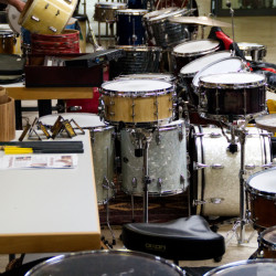 Holger Reith zeigt neben einem Drumset eine große Auswahl von unterschiedlichen Snares, darunter erstmals eigene Lagenkessel! Tolle Instrumente, die über jeden Zweifel erhaben sind!